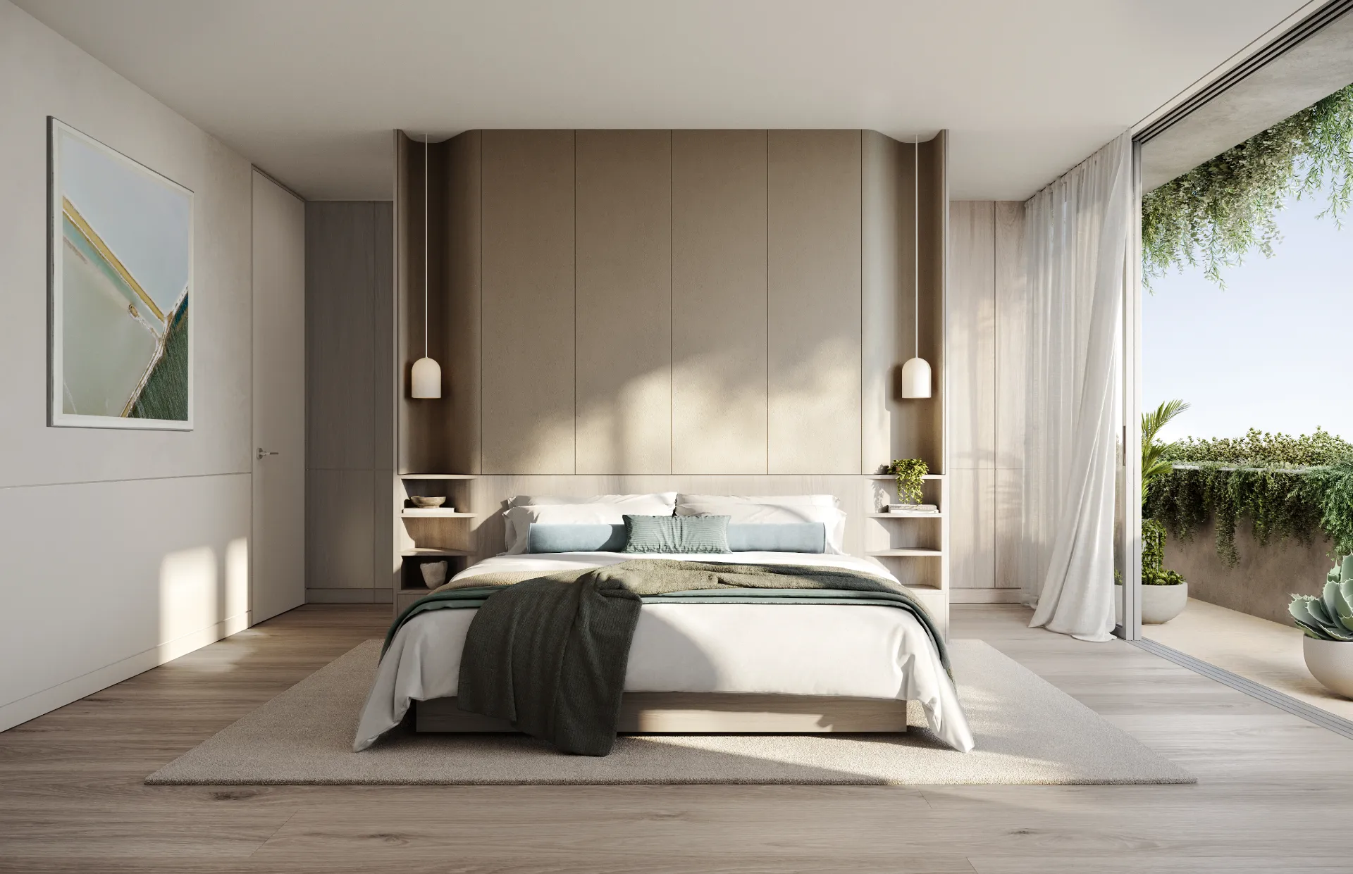 Sleeping zones promote wellness with a focus on muted tones and tactile materials. Custom bedheads, crafted from natural timber and leather, subtly float in the space for a touch of quiet luxury.