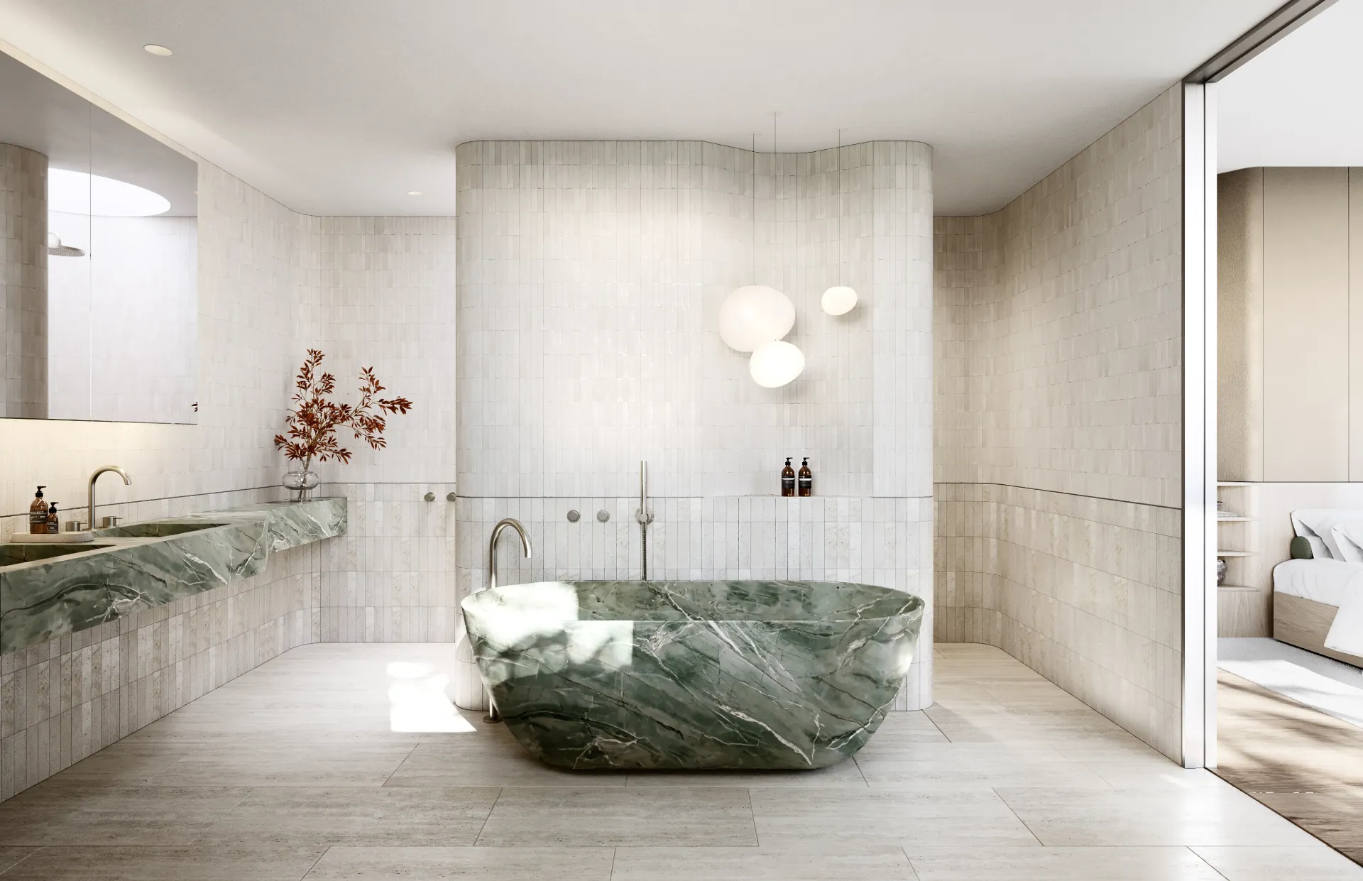 A spa like retreat with subtle curves, circular skylight and green quartzite features. Generous in scale to facilitate strong starts to the day yet innately calming for indulgent wind downs.